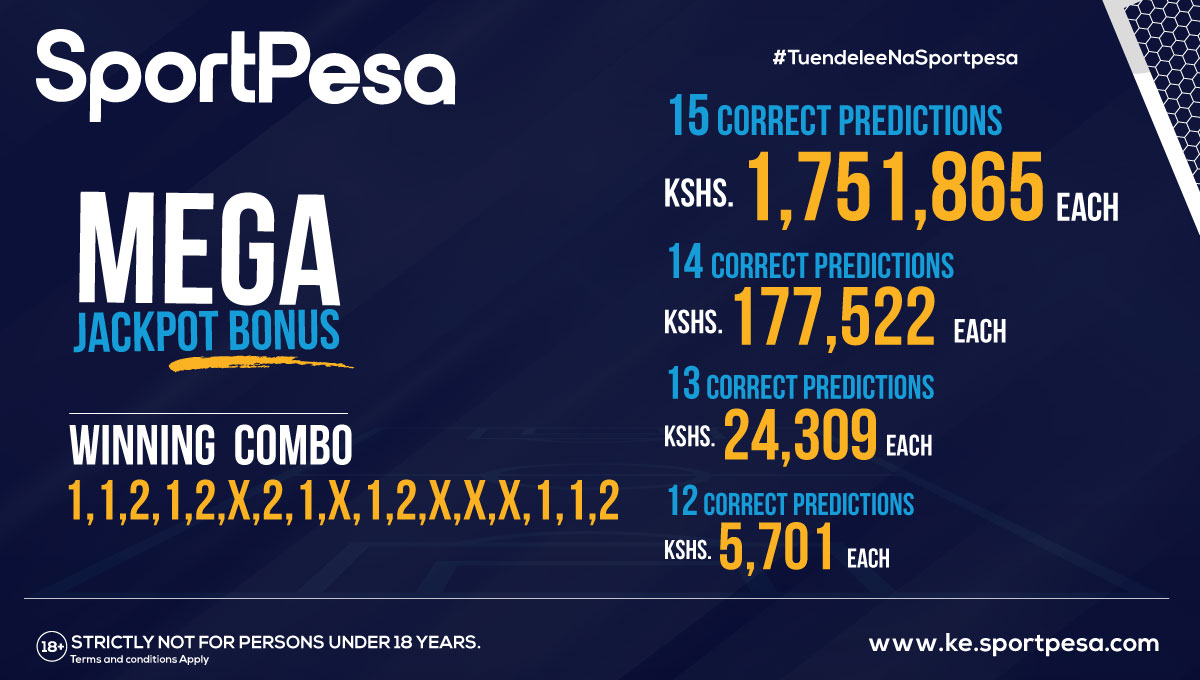 Accurate Sportpesa Mega Jackpot predictions for this weekend are ready, and the amount to be won has been increased to Ksh252.6Million. Last weekend we managed to get 12/17 correct predictions which won Ksh.5,701 in bonuses. We are right now sending 3 accurate versions of Sportpesa Mega Jackpot Predictions, Betika Grand Jackpot Predictions for this week plus 100% Sure Daily Multibet of over 20 odds via SMS. So if you want to subscribe, do it now and get the tips via SMS immediately.