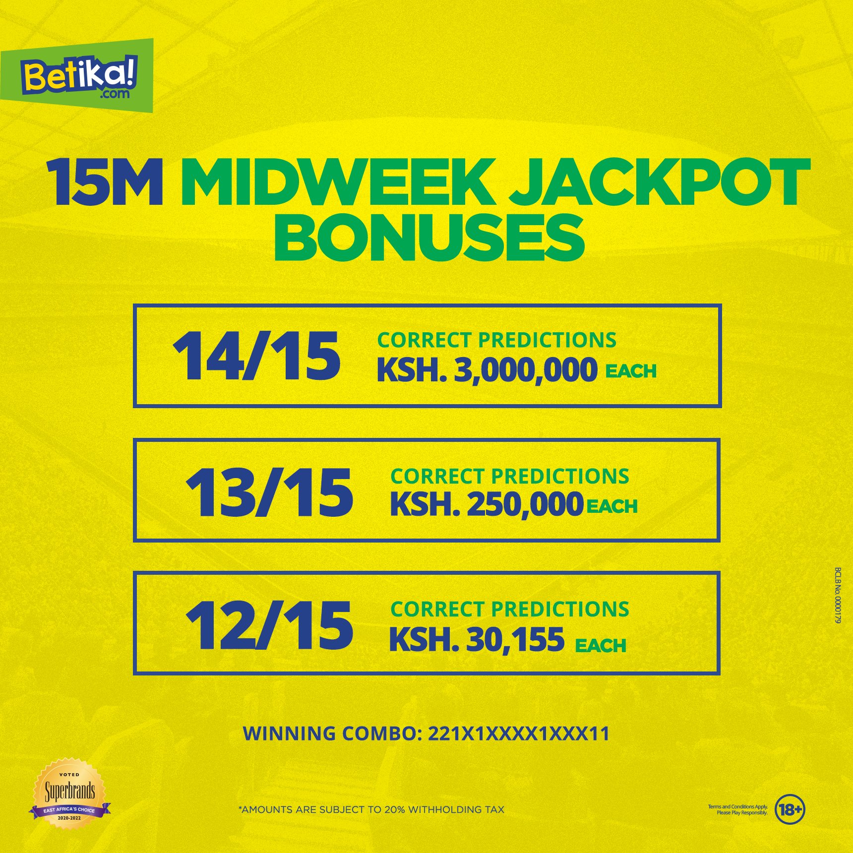 Betika Midweek Jackpot was successfully concluded over the weekend, we had several winners. Unfortunately, nobody managed 15/15 correct predictions. The winner managed 14/15 correct predictions and won Ksh 3M!