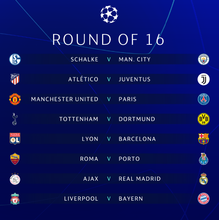 Jose Mourinho’s Manchester United will take on French giants Paris Saint-Germain in the last 16 of the Champions League, while Liverpool was drawn against fellow five-time winners Bayern Munich in Nyon on Monday.