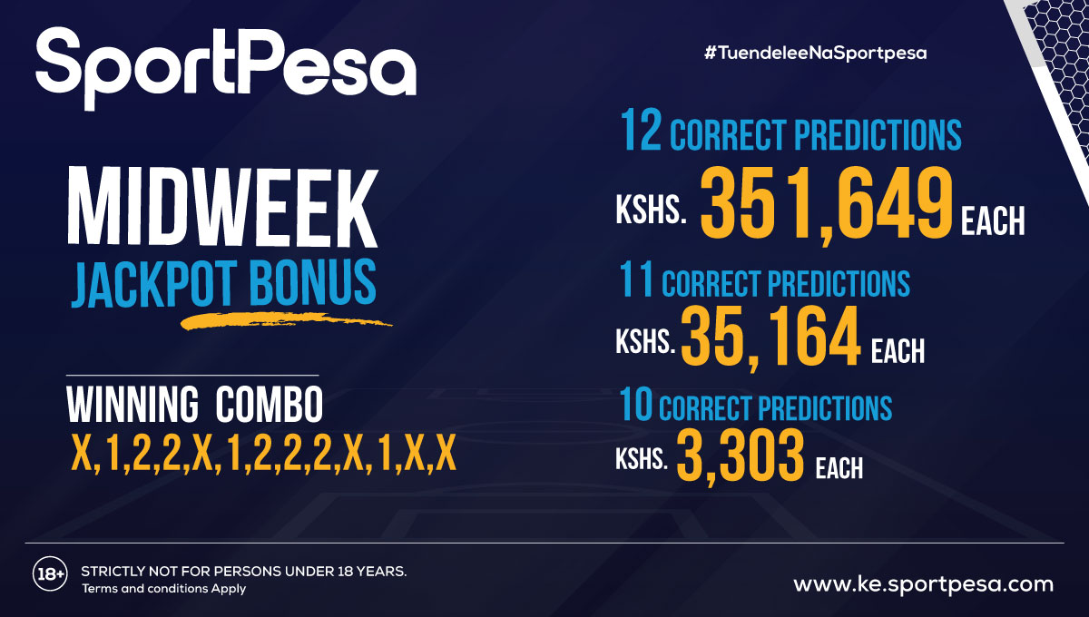 Congratulations to everyone who played the SportPesa Midweek Jackpot, we managed to get 10/13 correct predictions which won a bonus of Ksh.3,303